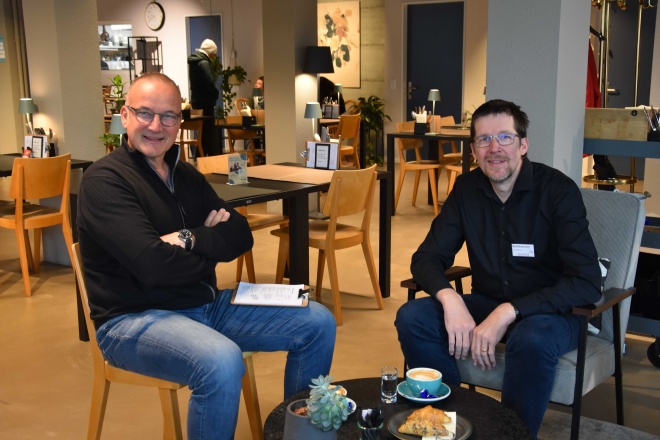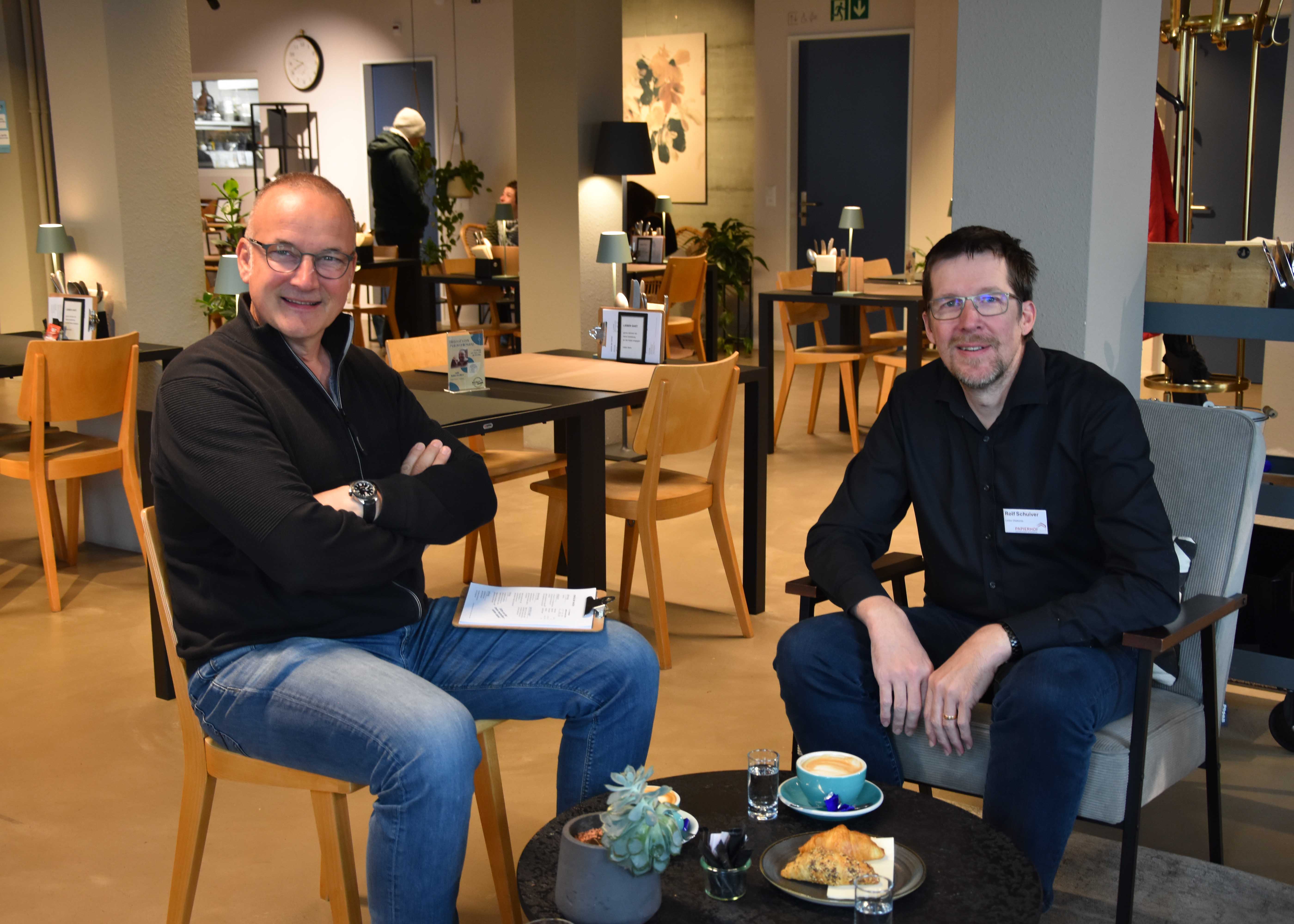 Im Papierhof gibt es das Chacao-Lädeli, eine christliche Buchhandlung, die auch schöne Geschenkartikel und Secondhand-Bücher verkauft. Neben den Angestellten sorgen insgesamt mehr als 70 Freiwillige dafür, dass der Betrieb im Papierhof läuft, zum Beispiel im Service oder bei der Verteilung von gespendeten Lebensmitteln der Organisationen «Schweizer Tafel» und «Tischlein deck dich» an 120 Bezüger. «Einige Geflüchtete aus der Ukraine helfen aus Dankbarkeit bei uns mit. Der Kontakt mit der Bevölkerung verbessert gleichzeitig ihre Deutschkenntnisse», freut sich der diakonische Leiter. Niemand muss die LEBA (Lebensmittelabgabe) mit leeren Taschen verlassen: Die beiden Landes- und verschiedene Freikirchen sammeln permanent haltbare Lebensmittel oder Hygieneprodukte, die dann abgegeben werden, wenn das Angebot an Frischwaren eher klein ist. Und: «Ein Bauer kommt jede Woche vorbei und bringt uns Kartoffeln und Zwiebeln», erzählt Rolf Schuiver. Solche Gesten berühren das Team.
