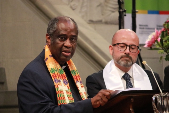 Der Ghanaer Setri Nyomi, Generalsekretär der Weltgemeinschaft Reformierter Kirchen, und der Kolumbianer César García, der die Mennonitische Weltkonferenz leitet, besiegeln im Grossmünster die Versöhnung.