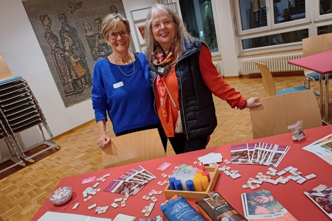 Im hinteren Teil des Saals kann man ins Angebot der Gemeinde Einblick nehmen. So stellen Mitarbeiterinnen des Claro-Ladens Produkte vor und verteilen Kaffee-Gutscheine. Zum Käfele, Einkaufen von fair produzierten Produkten oder zum Mithelfen sei man immer willkommen. Ein Flyer weist auf die Mahnwache für verfolgte Christen hin, die von CSI (Christian Solidarity International) am 10. Dezember in der ganzen Schweiz durchgeführt wird. Ein anderer lädt zum Männerforum ein – eine Plattform für Gespräche über persönliche, soziale, kulturelle, spirituelle oder theologische Themen. So wurde kürzlich Peter Widmer von Heartwings eingeladen. Zusammen mit seiner Frau Dorothee und einem Team besucht er Prostituierte im Rotlichtviertel Zürichs, bietet Gespräch und Gebet an. Und sie helfen beim Ausstieg, wenn eine der Frauen das möchte.