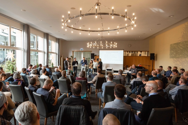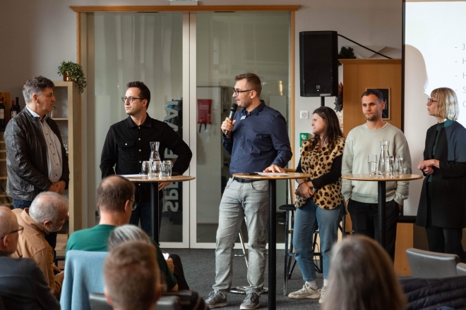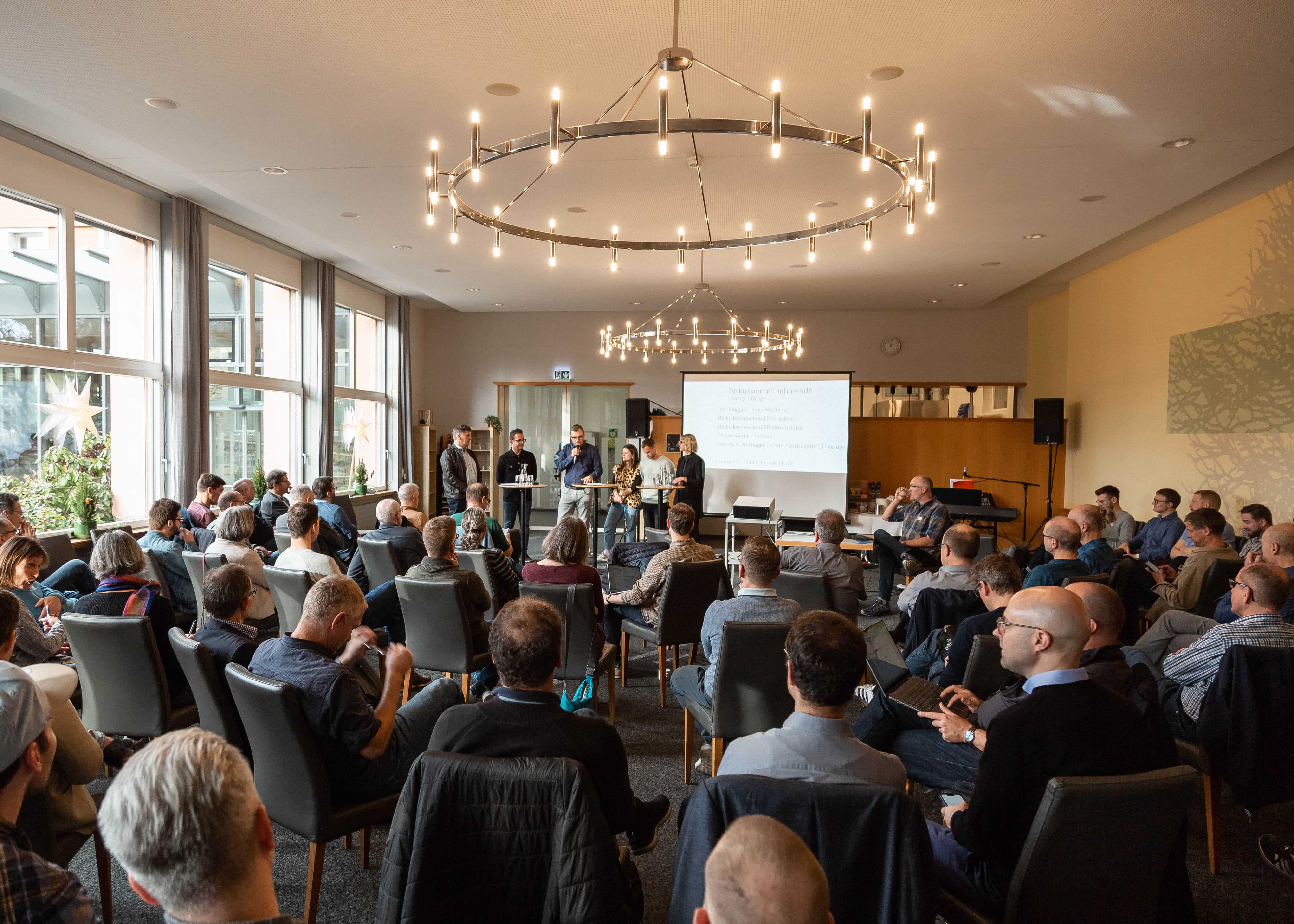 Podium mit Stefan Vatter, Egzon Shala, Moderator Daniel Janzen, Jael Binggeli, Christian Derflinger und Heike Breitenstein