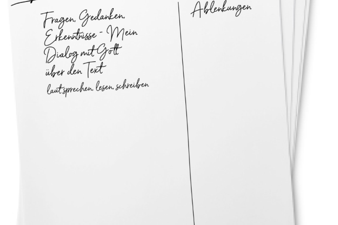 Eine Spalte rechts ist für alles, was in meinem Kopf hochploppt, wenn ich anfange, in den Vers einzutauchen. Meine Erfahrung ist nämlich: Sobald ich mich fokussieren will, werde ich mit banalen Gedanken bombardiert – oder auch mit unfassbar dringlichen (manchmal auch schrägen). Die rechte Spalte auf meiner Seite hilft mir, weil ich dort jegliche Gedanken hinschreibe, die mich ablenken, das heisst, die nicht der Bibelvers sind oder sich um den Vers drehen. Zum Beispiel: «Lisa anrufen, Termin mit Zahnarzt ausmachen, Wäsche waschen», aber auch: «Ich hab grad überhaupt keine Lust auf Gott, ich fühle mich so mies, ich bin zornig auf...» Wenn ich meine Ablenkungen dort aufschreibe, sind sie aufgehoben. Ich vergesse sie nicht (vor allem, wenn es wichtige Dinge sind) und kann die Liste später abarbeiten. Jetzt kann ich mich aber fokussieren, anstatt die nächste halbe Stunde damit zu verbringen, meine Gedanken irgendwie zu lenken und in den Griff zu bekommen, gegen sie anzubeten oder einfach aufzugeben.