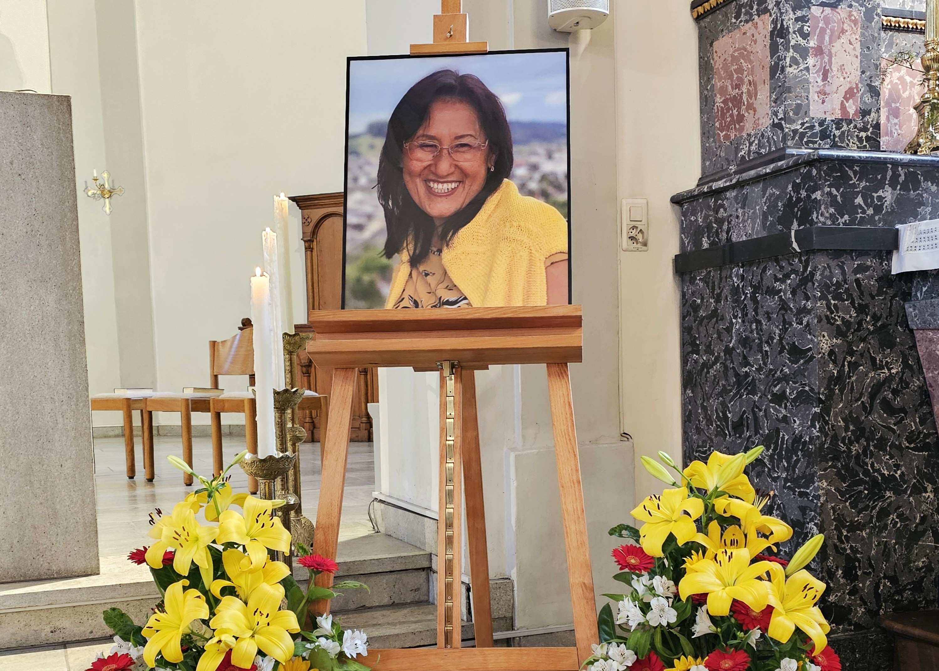 Rosalbas Abschiedsfeier fand am Nachmittag statt. Vorne rechts erinnerte ein Foto der siebenfachen Mutter und fünffachen Grossmutter an unbeschwerte Zeiten. Die Farben des bunten Blumenschmucks passten perfekt: gelbe Lilien und Sonnenblumen für Rosalbas Lebensfreude, weisse, filigrane Alstromerien für ihren feinen, reinen Charakter, und leuchtend rote Gerberas als Sinnbild der Liebe, mit der Rosalba den Menschen begegnete. Eine sprudelnde Liebe, von deren übernatürlicher Quelle die Latina gern und oft erzählte.